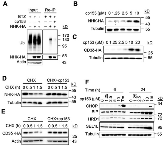 cp153 inhibits ERAD and induces ER stress. (A) cp153 reduces NHK ubiquitination. Re-immunoprecipitation (Re-IP) of HA-tagged NHK from HeLa cells treated with cp153 or DMSO for 4 h in the presence of BTZ. Immunoblots show ubiquitin (Ub) and NHK-HA levels. Input: 5% of total lysate. (B,C) cp153 stabilized NHK (B) and CD3δ (C) in a dose-dependent manner. 293 cells stably expressing NHK-HA or CD3δ-HA were treated with cp153 overnight and then processed for IB. (D,E) NHK (D) or CD3δ (E) degradation was determined via cycloheximide (CHX) chase. (F) HeLa cells were treated with increasing concentrations of cp153 for 24 h and processed for immunoblotting. Tunicamycin (Tm) was used as a positive control.