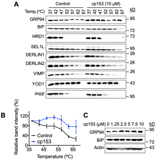 To investigate cp153’s mechanism of action, we employed the Cellular Thermal Shift Assay (CETSA) to screen for potential target engagement among ERAD-related proteins. This approach exploits the principle of the ligand-induced thermal stabilization of target proteins [25,26,27,28]. Initial screening across a temperature gradient (37–67 °C) revealed a significant thermal shift, specifically for GRP94 following 1 h treatment with 10 µM of cp153 (Figure 3A,B), while the other ERAD components examined showed no effect. Based on the thermal denaturation profile of GRP94, we selected 67 °C for subsequent dose–response experiments. Consistent with target engagement, cp153 treatment resulted in the dose-dependent stabilization of GRP94 (Figure 3C), with increased protein levels detectable at temperatures that denatured GRP94 in untreated controls. This concentration-dependent thermal stabilization strongly suggests a physical interaction between cp153 and GRP94. These results suggest that GRP94 is a cellular target of cp153 in the ERAD pathway.