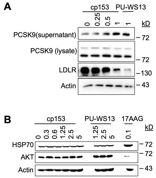 cp153 increases PCSK9 secretion and LDLR degradation without inducing cytosolic HSP90 responses. (A) Immunoblots of PCSK9 (supernatant/lysate) and LDLR in cells treated with cp153 or PU-WS13 for 24 h. (B) HSP70 and AKT levels after treatments with cp153, PU-WS13, or 17AAG. β-actin: loading control.