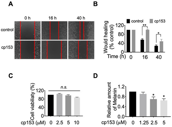 cp153 inhibits HeLa cell migration and melanin production. (A) Representative wound images (0, 16, and 40 h) with cp153 or DMSO control. (B) Quantified wound closure (mean ± SD, n = 3). (C) Cell viability after 40 h treatment. (D) Melanin content in B16F10 cells after 40 h treatment, with indicated concentrations of cp153 or PU-WS13. Data normalized to DMSO control (mean ± SD, n = 3). Unpaired two-tailed Student’s t-test was performed. * p < 0.05, ** p < 0.01, and n.s. means not significant.