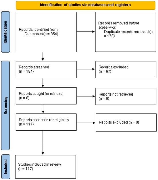 The initial search provided 354 studies (PubMed—143; Scopus—121; Web of Science —90). After excluding duplicates, 184 studies underwent title and abstract screening. Of these, 67 were excluded for not meeting the inclusion criteria. The remaining 117 studies progressed to full-text validation, all of which met eligibility criteria and were included in the final narrative synthesis (Figure 1). This review was not registered in PROSPERO, as data extraction and analysis were completed prior to the decision to register the protocol.