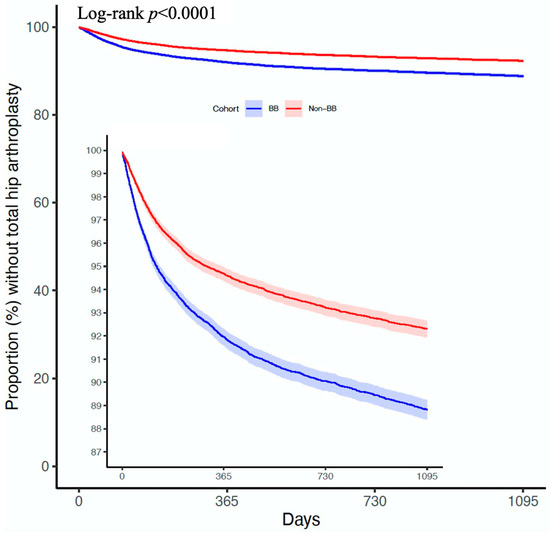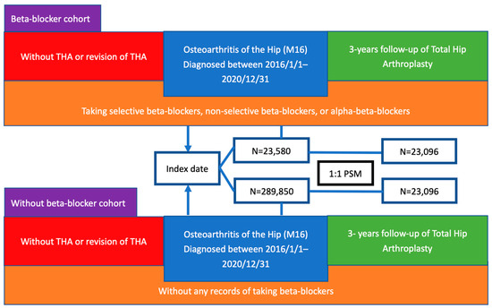 This study focused on patients with hip OA. The inclusion criteria comprised all patients whose hip OA was diagnosed between 1 January 2016 and 31 December 2020. Patients with congenital deformities of the hip or osteonecrosis were excluded because these conditions represent distinct pathological entities with different surgical indications and progression trajectories, which could confound the association between BB use and THA risk in primary OA. Furthermore, patients with any prior THA-associated procedure records were also excluded to avoid possible reporting bias. Diagnosis and treatment were conducted using electronic codes, and detailed coding was provided in