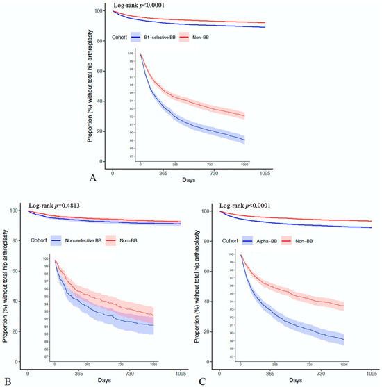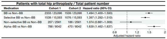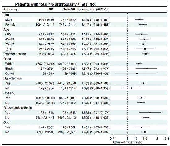 In this context, we hypothesize that BB use is associated with differential risks of hip arthroplasty among patients with hip OA, and that such risks may vary across BB subclasses (e.g., selective β1-blockers, non-selective BBs, and α–β blockers), each with distinct receptor profiles and hemodynamic effects [