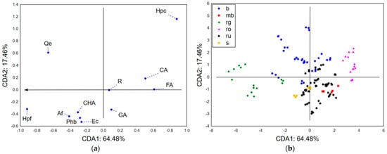 CDA-chemical characterization: (a) the loadings of the first two canonical roots and (b) the position of the analyzed samples in the space defined by the first two canonical axes. Hpc—hypericin, Hpf—hyperforin, Af—amentoflavone, R—rutin, Qe—quercetin, Ec—epicatechin, FA—ferulic acid, GA—gallic acid, CHA—chlorogenic acid, CA—caffeic acid, Phb—p-hydroxy benzoic acid, b—H. barbatum, mb—H. montbretii, rg—H. richerii subsp. grisebachii, ro—H. rochelii, ru—H. rumeliacum, and s—H. spruneri.