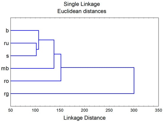 Hierarchical cluster analysis results—chemical characterization. b—H. barbatum, mb—H. montbretii, rg—H. richerii subsp. grisebachii, ro—H. rochelii, ru—H. rumeliacum, and s—H. spruneri.