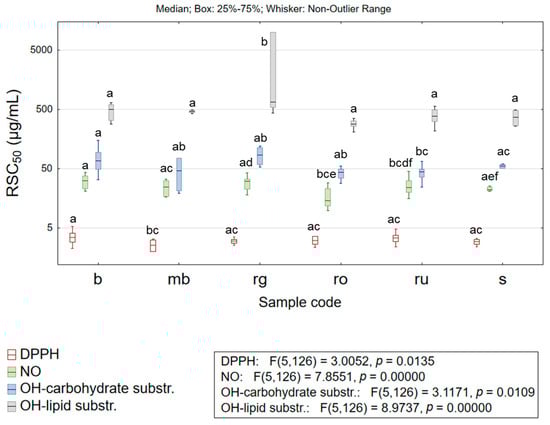 Box plots of the results describing the antioxidant potential of the studied extracts. Box plots (box—interquartile range, line—median value, whiskers—non-outlier range) were generated by considering all the results obtained for extracts of a specified taxon regarding a selected variable. The different lower-case letters denote statistically significant differences (p < 0.05) between evaluated species; DPPH—2,2-diphenyl-1-picrylhydrazyl radical, NO—nitroso radical, OH—hydroxyl radical, b—H. barbatum (n = 11 samples), mb—H. montbretii (n = 2 samples), rg—H. richerii subsp. grisebachii (n = 5 samples), ro—H. rochelii (n = 5 samples), ru—H. rumeliacum (n = 19 samples), and s—H. spruneri (n = 2 samples).