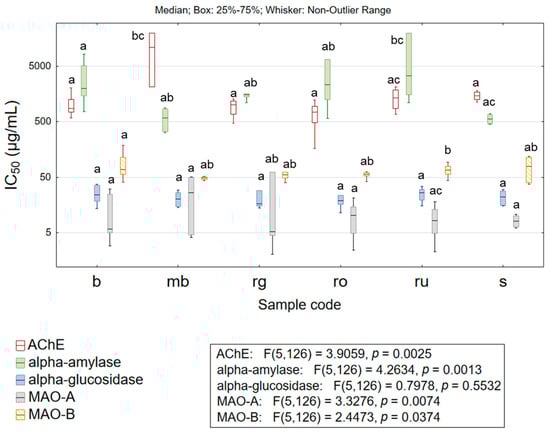 Box plots of the results describing the enzyme inhibitory potential of the studied extracts. Box plots (box—interquartile range, line—median value, whiskers—non-outlier range) were generated by considering all the results obtained for extracts of the specified taxon regarding the selected variable. The different lower-case letters denote statistically significant differences (p < 0.05) between evaluated species; AChE—acetylcholinesterase, MAO-A—monoamine oxidase A, MAO-B—monoamine oxidase B, b—H. barbatum (n = 11 samples), mb—H. montbretii (n = 2 samples), rg—H. richerii subsp. grisebachii (n = 5 samples), ro—H. rochelii (n = 5 samples), ru—H. rumeliacum (n = 19 samples), and s—H. spruneri (n = 2 samples).