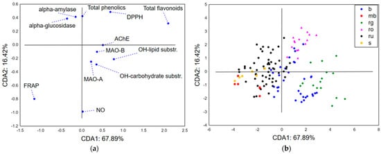 CDA-biological potential: (a) the loadings of the first two canonical roots and (b) the position of the analyzed samples in the space defined by the first two canonical axes. DPPH—2,2-diphenyl-1-picrylhydrazyl radical, NO—nitroso radical, OH—hydroxyl radical, FRAP—ferric reducing antioxidant potential, AChE—acetylcholinesterase, MAO-A—monoamine oxidase A, MAO-B—monoamine oxidase B, b—H. barbatum, mb—H. montbretii, rg—H. richerii subsp. grisebachii, ro—H. rochelii, ru—H. rumeliacum, and s—H. spruneri.