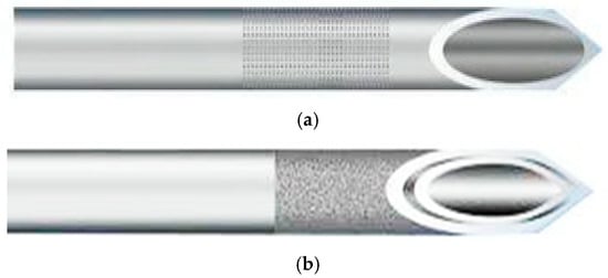Currently, two principal needle types are used in ART procedures: the single-lumen aspiration needle (SLN) and the double-lumen aspiration needle (DLN) [,]. These devices differ not only in structure but also in procedural implications and clinical outcomes. Table 1 outlines their dimensional specifications, while Figure 1 illustrates the anatomical differences at the needle tip. The selection between SLN and DLN is typically driven by the clinical scenario and specific procedural goals. The SLN, equipped with a single channel for aspiration, enables a streamlined retrieval process, typically resulting in shorter procedure times []. In contrast, the DLN offers a more complex configuration, which may include either a single channel that alternates between aspiration and flushing (pseudo-double-lumen) or two distinct lumens—one for aspiration and another for follicular flushing [,]. Flushing theoretically increases oocyte yield by re-perfusing the follicle, potentially reducing oocyte retention and enhancing embryo production []. However, this presumed advantage remains contested. A study by Marcelo et al. (2021) found no statistically significant difference in the follicle-to-oocyte ratio between SLN and DLN among patients with poor ovarian response []. Moreover, several reports indicate that DLNs are associated with longer procedural durations, increased bleeding risk, greater invasiveness, and higher patient discomfort due to the added flushing step [,,,,].