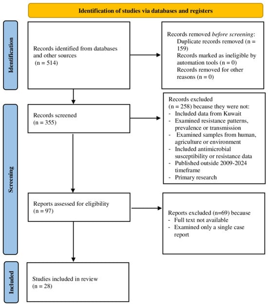 APA StyleAl-Dhumair, A., Al-Hasan, M., Al-Khalaifah, H., & Al-Mutawa, Q. (2025). A 15-Year One Health Approach to Antimicrobial Resistance in Kuwait from Hospitals to Environmental Contexts: A Systematic Review. Life, 15(9), 1344. https://doi.org/10.3390/life15091344
