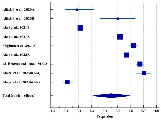 | Prevalence of microbes in humans | 9 | High | Serious (I2 = 99.62%) | Not serious | Not serious | No | 44.95%, 95% CI (30.58 to 59.76), | Low θθ |