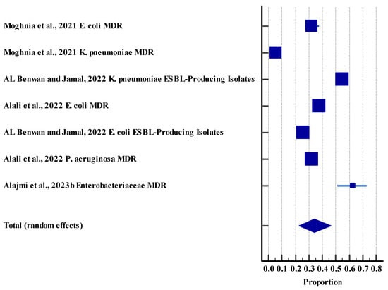 | K. pneumoniae | Multidrug resistance, extended-spectrum beta-lactamase, carbapenem resistance | Multidrug resistance: up to 36.2%; extended-spectrum beta-lactamase: up to 91%; carbapenem: up to 38% | Clinical, environmental | [40,42,49,53] |