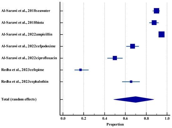 | E. coli | Multidrug resistance, extended-spectrum beta-lactamase, carbapenem, and ampicillin resistance | Multidrug resistance: 38.7–91.4%; extended-spectrum beta-lactamase: up to 62.4%; carbapenem: up to 10% | Clinical, sewage, marine (seawater and biota), sediment | [42,49,59,66] |