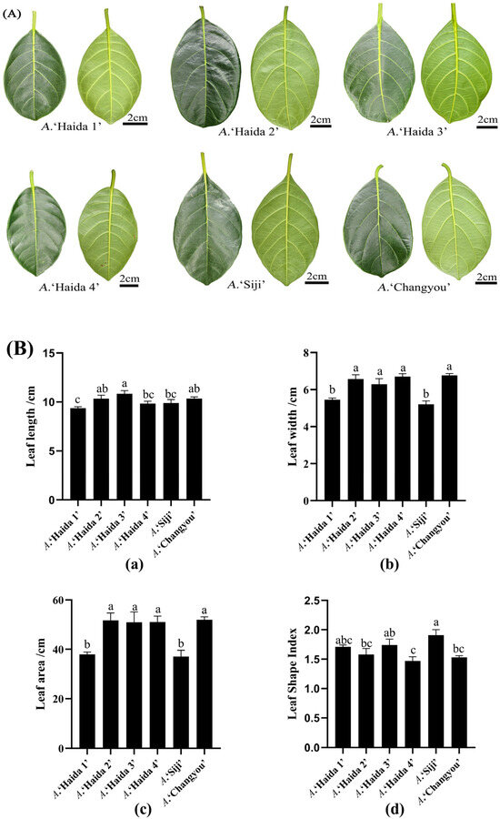 Leaf width, leaf length, leaf area, and leaf shape index were measured for the leaves of six cultivars of jackfruit, and the results showed that there were significant differences in leaf size and morphological characteristics among the six cultivars of jackfruit (Figure 1). Among them, A. ‘Haida 3’ had the longest leaf blade and A. ‘Haida 1’ had the shortest leaf blade; A. ‘Haida 1’ and A. ‘Siji’ had significantly smaller leaf widths and leaf areas than the other jackfruit cultivars; and A. ‘Siji’ had a significantly higher leaf shape index than that of A. ‘Haida 2’, A. ‘Haida 4’, and A. ‘Changyou’.