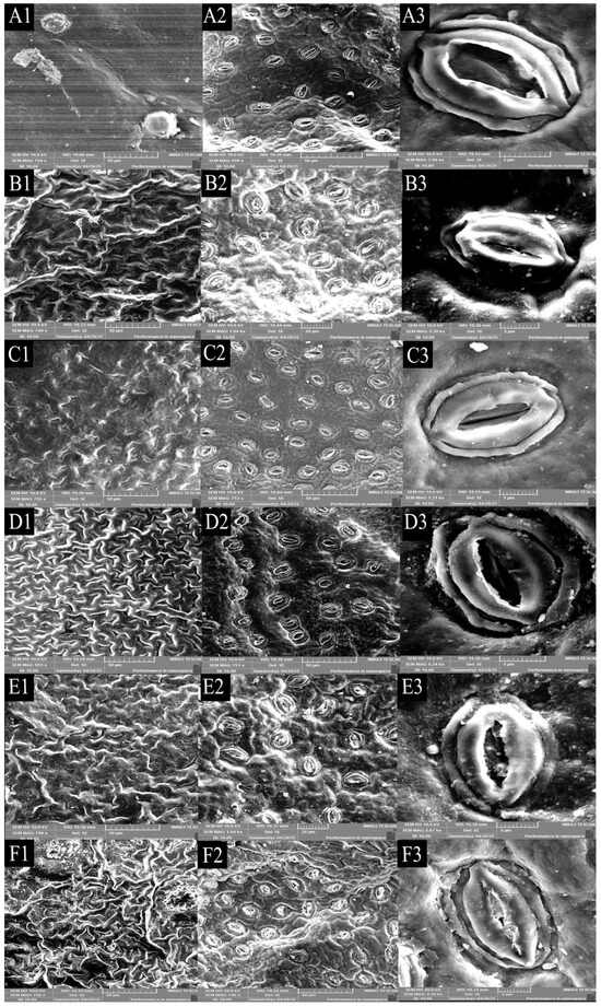 Electron microscope scanning and stomata of leaves of different jackfruit cultivars. (A) A. ‘Haida 1’; (B) A. ‘Haida 2’; (C) A. ‘Haida 3’; (D) A. ‘Haida 4’; (E) A. ‘Siji’; (F) A. ‘Changyou’. 1: Upper epidermal electron microscopy; 2: lower epidermal electron microscopy; 3: stomata.