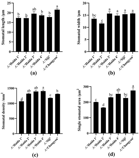 Comparison of the size of stomata in different cultivars of jackfruit. (a) Stomatal length; (b) stomatal width; (c) stomatal density; (d) area of a single stomatal pore. Different lowercase letters indicate significant differences (p < 0.05).