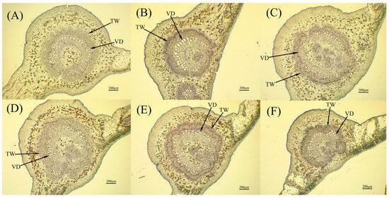 Anatomical structure of leaf vein sections of different jackfruit cultivars. (A) A. ‘Haida 1’; (B) A. ‘Haida 2’; (C) A. ‘Haida 3’; (D) A. ‘Haida 4’; (E) A. ‘Siji’; (F) A. ‘Changyou’. TW: Thick wall thickness; VD: vessel diameter.