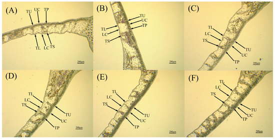 Anatomical structure of leaf flesh slices of different jackfruit cultivars: (A) A. ‘Haida 1’; (B) A. ‘Haida 2’; (C) A. ‘Haida 3’; (D) A. ‘Haida 4’; (E) A. ‘Siji’; (F) A. ‘Changyou’. TU: thickness of upper epidermal cells, TL: thickness of lower epidermal cells, UC: thickness of the upper epidermal thick-walled parenchyma, LC: lower epidermal thick-walled parenchyma thickness, TP: palisade parenchyma thickness, TS: sponge parenchyma thickness.