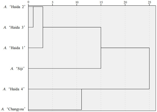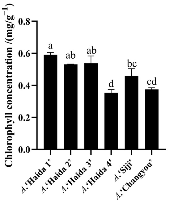 The chlorophyll concentration of different jackfruit cultivars is shown in Figure 6, and there were significant differences in the chlorophyll concentration among the different jackfruit cultivars. A. ‘Haida 1’ had the highest chlorophyll concentration and A. ‘Haida 4’ had the lowest chlorophyll concentration; the chlorophyll concentrations were, in descending order, A. ‘Haida 1’, A. ‘Haida 3’, A. ‘Haida 2’, A. ‘Siji’, A. ‘Changyou’, and A. ‘Haida 4’.