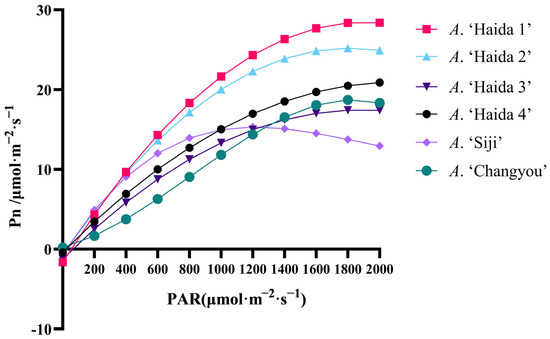 The corresponding change curves of the light intensity of different jackfruit leaves were obtained by fitting the equations (Figure 7). Under a normal variation in the light intensity, the net photosynthetic rate of each variety gradually increased with increasing light intensity. The light saturation points of different jackfruit cultivars were A. ‘Haida 1’ > A. ‘Haida 2’ > A. ‘Haida 4’ > A. ‘Changyou’ > A. ‘Haida 3’ > A. ‘Siji’ under the variation in light intensity of 2000 μmol-m−2-s−1. The light compensation points of different Pollosia cultivars were different: A. ‘Haida 3’ > A. ‘Haida 1’ > A. ‘Haida 2’ > A. ‘Haida 4’ > A. ‘Siji’ > A. ‘Changyou’. A. ‘Siji’ reached the light saturation point under the change in light intensity of 1200 μmol-m−2-s−1, which occurred earlier than that of all the other cultivars to reach the saturation point.