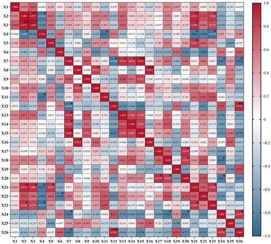Correlation analysis of leaf indicators among different cultivars of jackfruit. X1: Leaf length; X2: leaf width; X3: leaf area; X4: leaf shape index; X5: leaf thickness; X6: vessel diameter; X7: palisade parenchyma thickness; X8: spongy parenchyma thickness; X9: thick wall thickness; X10: thickness of upper epidermal cells; X11: thickness of the upper epidermal thick-walled parenchyma; X12: thickness of lower epidermal cells; X13: lower epidermal thick-walled parenchyma thickness; X14: parenchyma ratio of palisade to spongy; X15: cell tightness ratio; X16: spongy mesophyll ratio; X17: stomatal width; X18: stomatal length; X19: stomatal density; X20: individual stomatal area; X21: net photosynthetic rate; X22: transpiration rate; X23: stomatal conductance; X24: intercellular CO2 concentration; X25: instantaneous water utilization; X26: chlorophyll concentration. *: significant correlation (p < 0.05); **: highly significant correlation (p < 0.01).