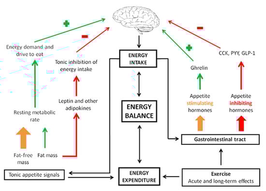 - Blundell, J.E.; Gibbons, C.; Caudwell, P.; Finlayson, G.; Hopkins, M. Appetite control and energy balance: Impact of exercise. Obes. Rev. 2015, 16 (Suppl. S1), 67–76. [Google Scholar] [CrossRef]