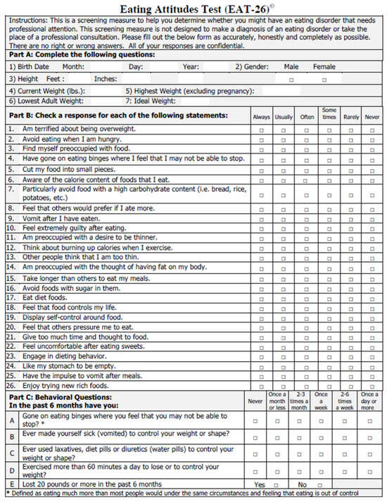 - Garner, D.M.; Olmsted, M.P.; Bohr, Y.; Garfinkel, P.E. The eating attitudes test: Psychometric features and clinical correlates. Psychol. Med. 1982, 12, 871–878. [Google Scholar] [CrossRef]