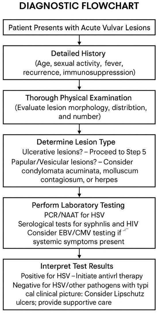 In the differential diagnosis of vulvar ulcers, it is crucial to consider paradoxical reactions such as Behçet’s disease induced by IL-17A inhibitors. Although this entity does not typically fall within the spectrum of viral infections, its inclusion underscores the importance of evaluating a patient’s pharmacological history and excluding noninfectious causes in the presence of vulvar ulcers [,]. For instance, paradoxical Behçet’s disease—characterized by recurrent oral and genital ulcers—has been reported in patients undergoing treatment with IL-17A inhibitors like ixekizumab and secukinumab for psoriasis or other immune-mediated diseases [,]. Recognizing this possibility helps clinicians avoid misdiagnosis and guides them toward discontinuing the inciting drug and instituting appropriate therapy.