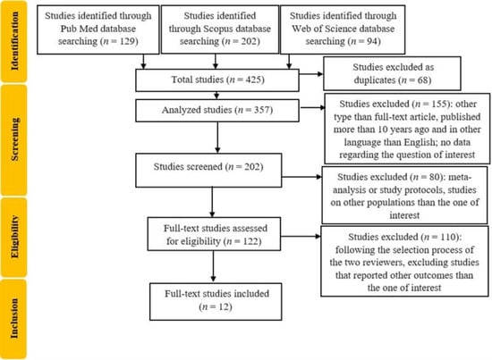 Studies that were excluded from the analysis were (i) literature reviews, meta-analyses, letters to the editors, case reports, or meeting abstracts; (ii) conducted on a non-human population; (iii) conducted on a population under 18 years of age; (iv) studies with unclear or incomplete data. Literature reviews, meta-analyses, and abstracts were excluded from the selection, but, where applicable, they were used for additional references.