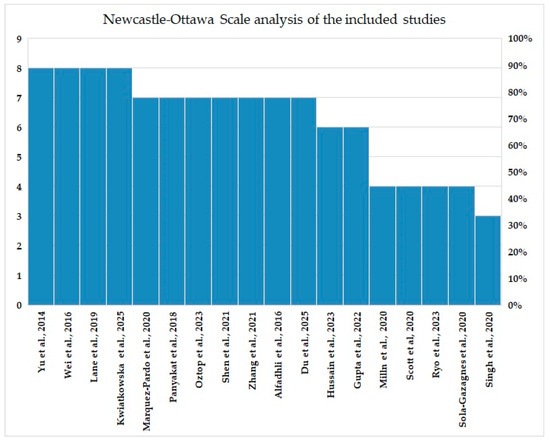 Histogram of the Newcastle–Ottawa Scale analysis of the included studies (Yu et al. [41], Wei et al. [39], Lane et al. [37], Kwiatkowska et al. [23], Marquez-Pardo et al. [32], Panyakat et al. [38], Oztop et al. [27], Shen et al. [30], Zhang et al. [31], Alfadhli et al. [40], Du et al. [24], Hussain et al. [26], Milln et al. [35], Scott et al. [33], Ryo et al. [25], Sola-Gazagnes et al. [34], Gupta et al. [28], Gupta et al. [29], Singh et al. [36]).