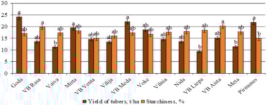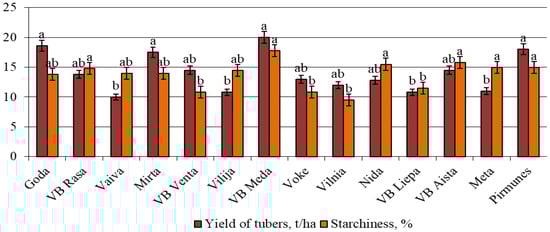 −1) were observed in ‘VB Meda’, ‘VB Aista’, and ‘Goda’, with statistically significant superiority (denoted by “a”). The highest starch content (≥16%) was also recorded in ‘VB Aista’, VB Meda’, and ‘Goda’, highlighting their dual potential for both productivity and processing quality. ‘Pirmūnės’, ‘Vilija’, and ‘VB Liepa’ exhibited lower yield and starch content, suggesting more limited agronomic or industrial use under the Ukrainian test conditions.