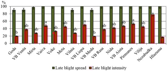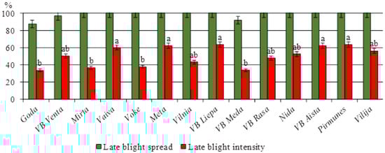 Among the tested varieties, ‘VB Meda’, ‘Goda’, and ‘Mirta’ demonstrated the lowest intensity of late blight symptoms (approximately 30–35%), indicating a higher level of resistance. These varieties form a statistically distinct group (denoted by the letters ‘a’ and ‘ab’) and can be considered as resistant genotypes. Moderate resistance was also observed in ‘VB Venta’, ‘VB Rasa’, ‘VB Aista’, and ‘Vokė’, with intensity levels remaining below 45%. The variety ‘Pirmūnės’ showed the highest disease incidence among Lithuanian lines, with 53% leaf and stem damage.