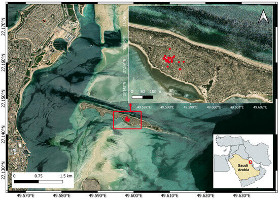 Map of Al-Fanateer Island, Eastern Saudi Arabia, showing the locations of Western Reef Heron nests marked by red dots. The red circle shows the geographical location of the study area. Map created using QGIS v. 3.40, an open-source software (QGIS Development Team, 2022).