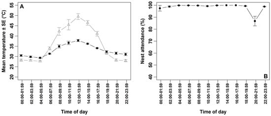 (A) Mean ambient temperature (±SE) recorded by camera-integrated data loggers positioned ~1.5 m from each nest (open triangles, n = 7 nests) and mean of temperature (±SE) recorded beneath the clutch by Thermochron iButton data loggers (filled circles, n = 7 nests). (B) Percentage of time spent by Western Reef Herons attending their nests in relation to ambient temperatures across the two-hour intervals (n = 7).