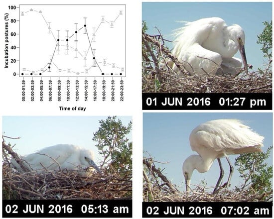 Top left: Incubation postures (%) of Western Reef Herons during two-hour intervals (n = 7 nests); shading posture: filled circles; sitting posture: open triangles; standing posture: open squares. Top right: shading posture, where the parent shades the eggs/chicks by drooping its wings over the nest without making full body contact. Bottom left: sitting posture, where the parent maintains full body contact with the eggs/chicks while sitting tightly on the nest. Bottom right: standing posture, where the parent stands on the nest without any physical contact with the eggs/chicks.