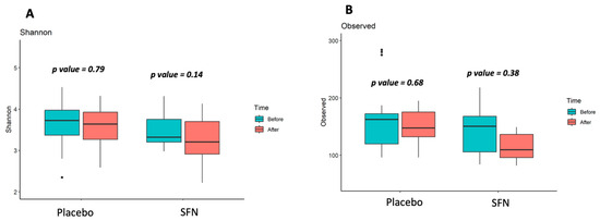 Gut microbiota alpha-diversity of patients with CKD on SFN and placebo supplementation. (A) Shannon index (diversity), (B) Observed ASVs (richness).