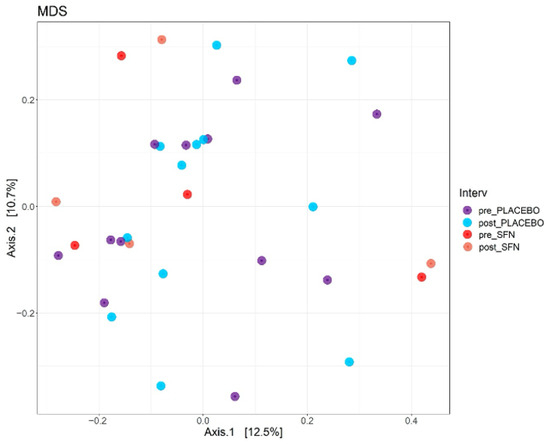 Figure 2 illustrates beta diversity, as determined by a Bray–Curtis-based multidimensional scaling (MDS) analysis of gut microbiota composition in patients with CKD who received a diet supplemented with SFN or placebo for one month. The results revealed a variation of only 12.5% (p-value = 0.001) in the bacterial community among individuals, and no statistically significant differences were detected between pre- and post-intervention time points in either the SFN or placebo groups. SFN supplementation did not significantly alter the gut microbiota at the level of bacterial community.