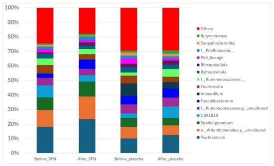 Gut bacterial composition of the SFN and placebo groups before and after the intervention. The compositions are presented as relative abundances at the genus level.