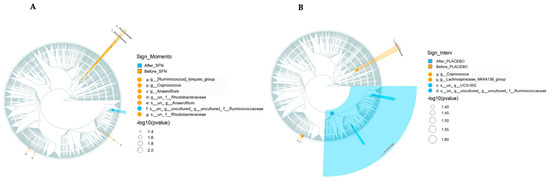 Cladogram representation of microbiome taxa associated with SFN or placebo. The treatments evaluated were (A) SFN and (B) placebo. Yellow indicates taxa enriched in the pre-treatment period, and blue indicates taxa enriched in the post-treatment period. Only taxa with nominal p < 0.05 are labeled.