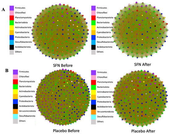 The gut bacterial co-occurrence networks were compared between the SFN and placebo groups (Table S1). Figure 5 shows the co-occurrence networks of colored genera in phyla of the SFN and placebo groups before and after the interventions. After one month of intervention with SFN, it was possible to observe a change in the central genera of the connections in the SFN group. The number of nodes (individual taxa) and edges (green lines represent positive connections between genera, while the red lines represent negative connections) decreased at most taxonomic levels. Furthermore, at the genus level, the total number of edges in the SFN group before intervention was 11,781, and it reduced to 7750 after SFN; that is, the microbial complexity of this group changed by 33%. The positive edges reduced from 5487 to 3679, and the negative from 6294 to 4071 in the SFN group (Figure 5A). In contrast, the placebo group exhibited even more pronounced changes; the total number of edges in the placebo group before the intervention was 40,186, which decreased to 18,145, representing a 54.8% reduction. The positive edges reduced from 18,428 to 8217, and the negative from 21,728 to 9928 in this group (Figure 5B).