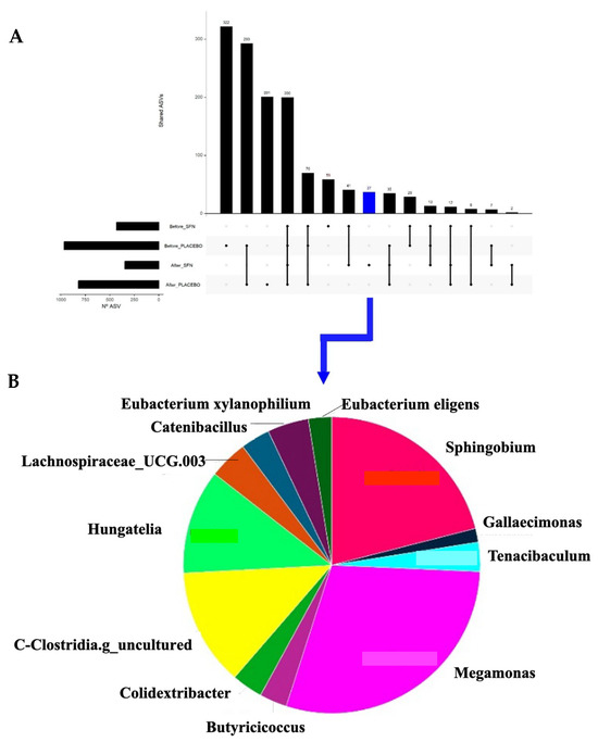 Shared ASVs across time and groups of intervention. (A) UpSet plot showing the number of shared and unique ASVs among the intervention groups. (B) Pie chart of the unique ASVs found in the gut microbiota of patients after intervention with SFN.