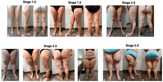 Stages and features of lipedema. Front (a), side (b) and back (c) pictures of women with lipedema Stage 1.0. 1.5, 2.0, 2.5 and 3.0. Three patients are presented for stage 2.5 to show the variety of presentations. All photos are of women with lipedema of the Allen and Hines type [27] with smaller ankles versus the Moncorps Type with a larger ankle cuff [28].