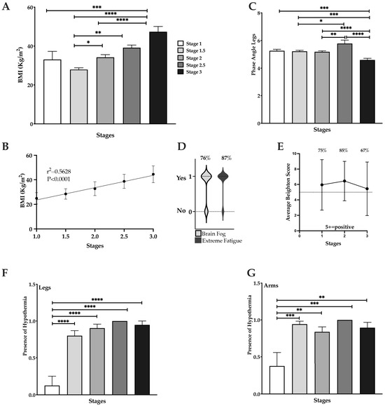 Multiple measures in lipedema patients. (A). BMI significantly increases by stage. (B). Correlation between BMI and stages. (C). Phase Angle, a marker of inflammation, was significantly lower in Stage 3. (D). Percentage of women with lipedema with brain fog and extreme fatigue. (E). Beighton scores and percent positive (Beighton score ≥ 5). (F). Percent affected by hypothermia in legs with Stage 1 significantly lower than other stages; (G). Percent affected by hypothermia in arms with Stage 1 significantly lower than other stages; * p ≤ 0.05, ** p ≤ 0.01, *** p ≤ 0.001, **** p ≤ 0.0001.