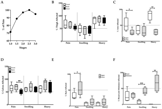 Pain, swelling and heaviness in lipedema tissues. (A). Pain increases with stage. B. Representation of total pain, swelling and heaviness of the thighs (B), arms (C), calves (D), back (E) and breast and abdomen (F). * p ≤ 0.05, ** p ≤ 0.01, *** p ≤ 0.001.