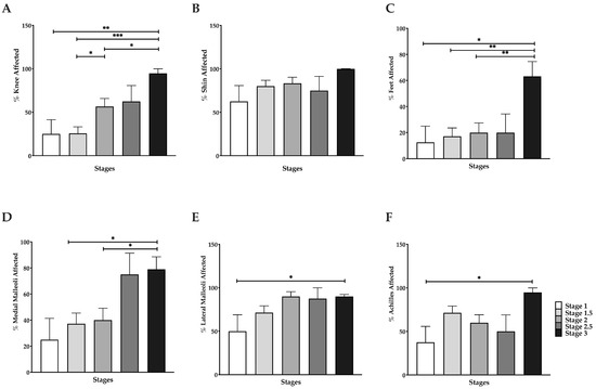 Additionally, our data show an increase in the percentage of fat around the medial malleolus from Stage 1.5 to Stage 3 (p = 0.02, Figure 4D), and from Stage 2 to Stage 3 (p = 0.048, Figure 4D). We also observed a significant increase in fat around the lateral malleolus between Stage 1 and Stage 3 (p = 0.0138, Figure 4D). Finally, fat accumulation around the Achilles tendon significantly increased from Stage 1 to Stage 3 (p = 0.026, Figure 4F).