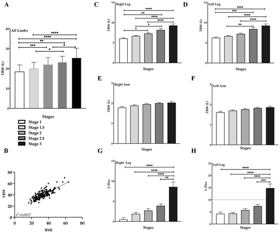 Total Body Water (TBW) Increases with Stage in Lipedema (bioimpedance spectroscopy). (A). TBW in four limbs across Lipedema stages. (B). Correlation between TBW and BMI. (C,D). TBW in right and left legs, respectively. (E,F). TBW in right and left arms, respectively. (G,H). Lymphedema risk by L-Dex increases by stage in the right and left leg, respectively. The dotted line indicates the upper limit of the normal range. * p ≤ 0.05, ** p ≤ 0.01, *** p ≤ 0.001, **** p ≤ 0.0001.