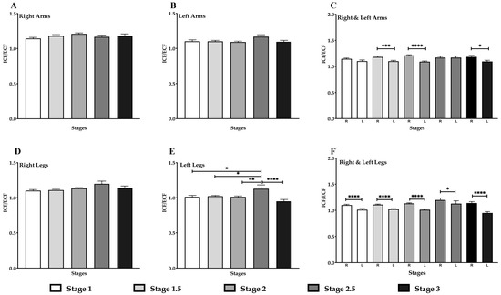 Ratio of ICF/ECF in Lipedema. (A,B). No difference between arms in lipedema stages. (C). Comparison between the right and left arms showing a decrease in the left arms compared to the right arms in Stage 1.5, 2 and 3. (D,E). Significant increase in left legs in stage 2.5 compared to other stages. (F). Comparison between the right and left legs showing a decrease in left legs compared to right legs in all stages. * p ≤ 0.05, ** p ≤ 0.01, *** p ≤ 0.001, **** p ≤ 0.0001.