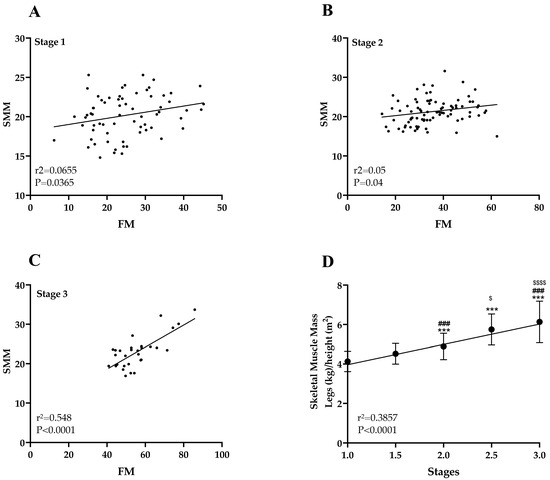 Correlation between skeletal muscle mass (SMM) and fat mass (FM) in the legs of lipedema stages 1–3. (A,B). There was no significant correlation between SMM & FM in Stage 1 (A) and Stage 2 (B). (C). Significant correlation between SMM and FM Stage 3. (D). Significant increase in SMM in the legs to height in all lipedema stages, including half stages. *** Significant difference from Stage 1; ### Significant difference from Stage 1.5; $ and $$$$ Significant difference from Stage 2. *** p ≤ 0.001; ### p ≤ 0.001, $ p ≤ 0.05, $$$$ p ≤ 0.0001.