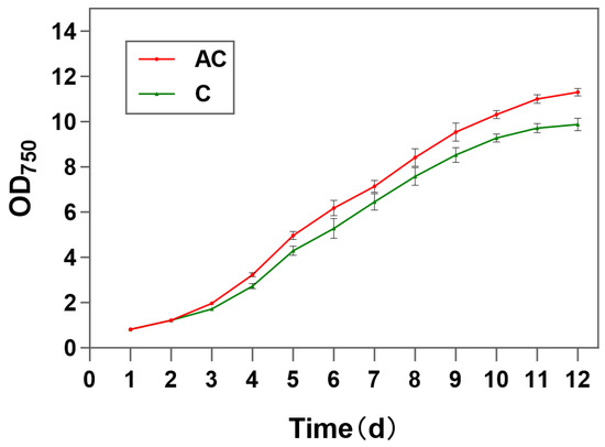 To assess changes in growth, physiological responses of N. oceanica were monitored under two distinct culture conditions: f/2 medium (C: control) and f/2 medium supplemented with 1 g/L NaAC (AC: experimental group). In this study, the growth of algae was evaluated by measuring the optical density (OD750) of the culture medium with a spectrophotometer. After 12 days of cultivation, significant differences in growth were observed between the control and experimental groups. The growth rate of N. oceanica in group AC was significantly higher than that in group A (Figure 1). It can be confirmed that sodium acetate does indeed increase the growth rate of N. oceanica.
