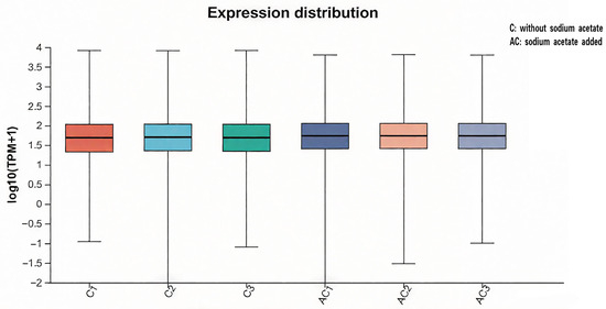 Boxplot of gene expression distribution. Each boxplot represented the minimum and maximum values, lower quartile, median and upper quartile of the expressed gene in the log10 TPM non-abnormal range in different samples. “AC” represents the experimental group with sodium acetate added, and “C” represents the control group without sodium acetate added.